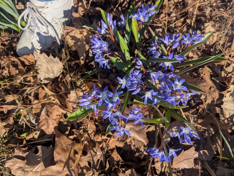 Deer, who thwart many garden plans, do not generally snarf down glory of the snow. Squirrels, those ace diggers and backyard thieves, don’t eat them either, though they will occasionally dig up bulbs and replant them elsewhere. When a chionodoxa turns up in some corner of my yard far from the original planting site, I know that it is the result of “squirrel landscaping”. Generally, I leave the plants alone, unless they are in a place that might get trampled by human feet. In my ongoing efforts to make peace with the local fauna, I try to think of squirrel landscaping as a form of serendipity. It beats futile efforts to scare away the unscareable fluffy-tailed rodents.