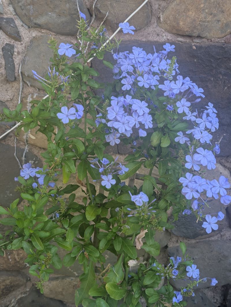 My plumbago is ravishing in its sunny garden setting, and I expect it to remain ravishing until frosts threaten. Sadly, it will not survive outdoors in places where fall and winter temperatures drop below forty degrees Fahrenheit. If you are wealthy, I suppose this means that you might also treat plumbago as an annual. The rest of us need to grow the plant in a container and haul it in when late fall rolls around. This is a pain in the neck, but generally worth it When your specimen comes into the house, give it a sunny corner and it will get through the winter nicely, benefitting from a haircut and a reduced watering schedule.